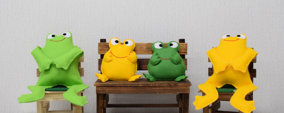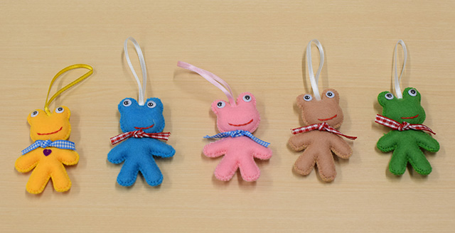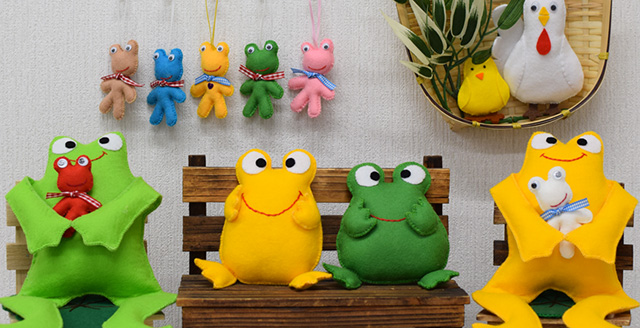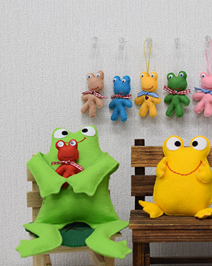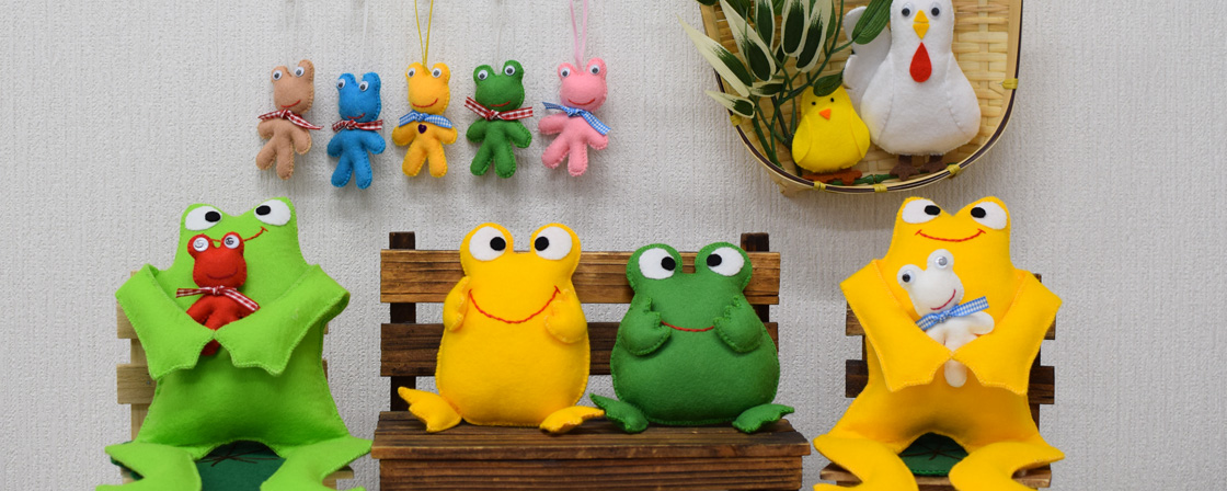 手作り手縫いで一つづつ丁寧に仕上げたフェルト生地のカエルくんたち