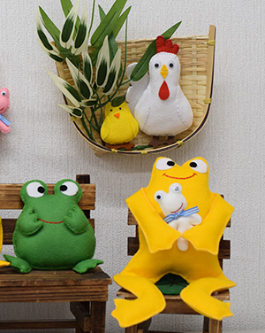フェルト生地の手作り手縫いのカエルと仲間たち